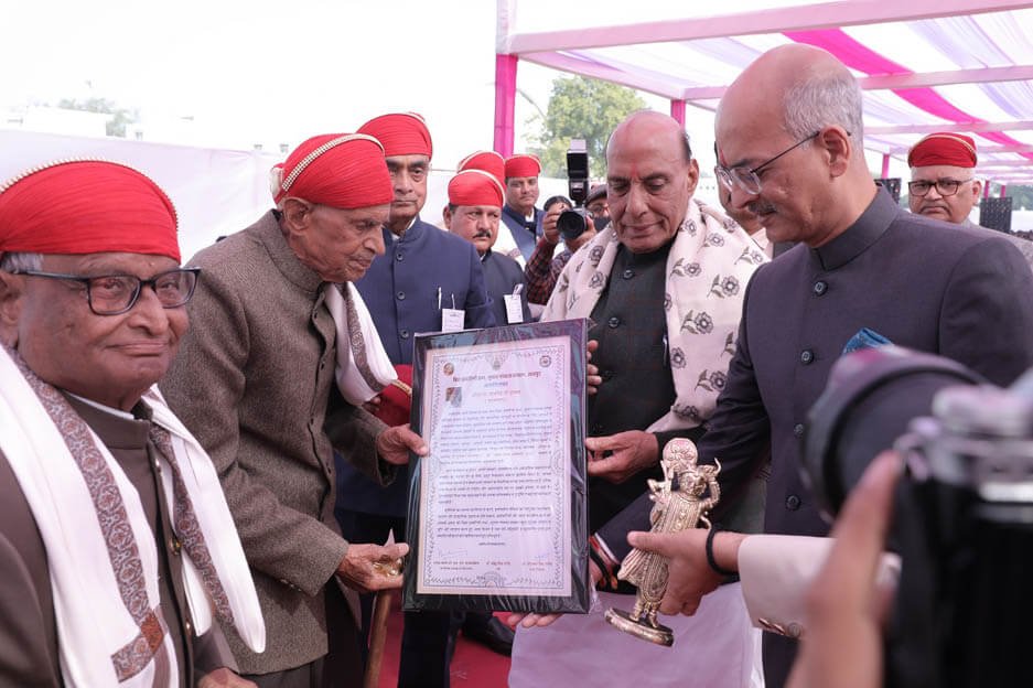 रक्षा मंत्री राजनाथ सिंह ने दिखाई सहजता:- अवार्ड से सम्मानित 102 वर्षीय विभूती व अन्य को सम्मानित करने के लिए मंच से स्वयं नीचे आ कर उनका सम्मान किया।