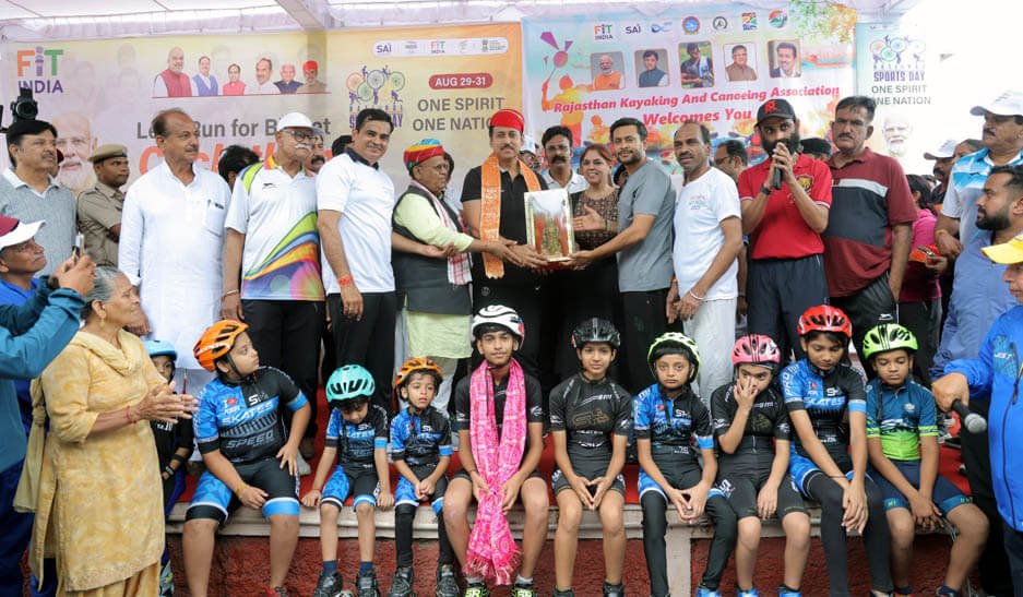 उदयपुर। वीरभूमि मेवाड़ से रविवार को फिट इंडिया का संदेश गूंजा। अवसर था खेल एवं युवा मामले मंत्रालय भारत सरकार के तत्वावधान में चल रहे फिट इण्डिया मुवमेंट के तहत राष्ट्रीय खेल दिवस के उपलक्ष्य में आयोजित साइक्लोथोन और मैराथन का। प्रशासन, उदयपुर विकास प्राधिकरण एवं क्षेत्रीय खेलकूद प्रशिक्षण केंद्र के तत्वावधान में विश्व प्रसिद्ध फतहसागर झील के किनारे आयोजित कार्यक्रम में खेल एवं युवा मामले विभाग तथा उद्योग एवं वाणिज्य विभाग के मंत्री ओलंपिक पदक विजेता कर्नल राज्यवर्द्धनसिंह राठौड़ ने शिरकत की। राज्यसभा सांसद चुन्नीलाल गरासिया, लोकसभा सांसद डॉ मन्नालाल रावत भी बतौर अतिथि उपस्थित रहे। राठौड़ स्वयं साइक्लोथोन में जुड़े तथा पूरे रूट पर साइकिलिंग करते हुए खिलाड़ियों का हौंसला बढ़ाया। अंतर्राष्ट्रीय स्तर के खिलाड़ी एवं मंत्री श्री राठौड़ को अपने बीच पाकर खिलाड़ियों, युवाओं, बच्चों के साथ-साथ शहर के हर आमो-खास का उत्साह चरम पर रहा।