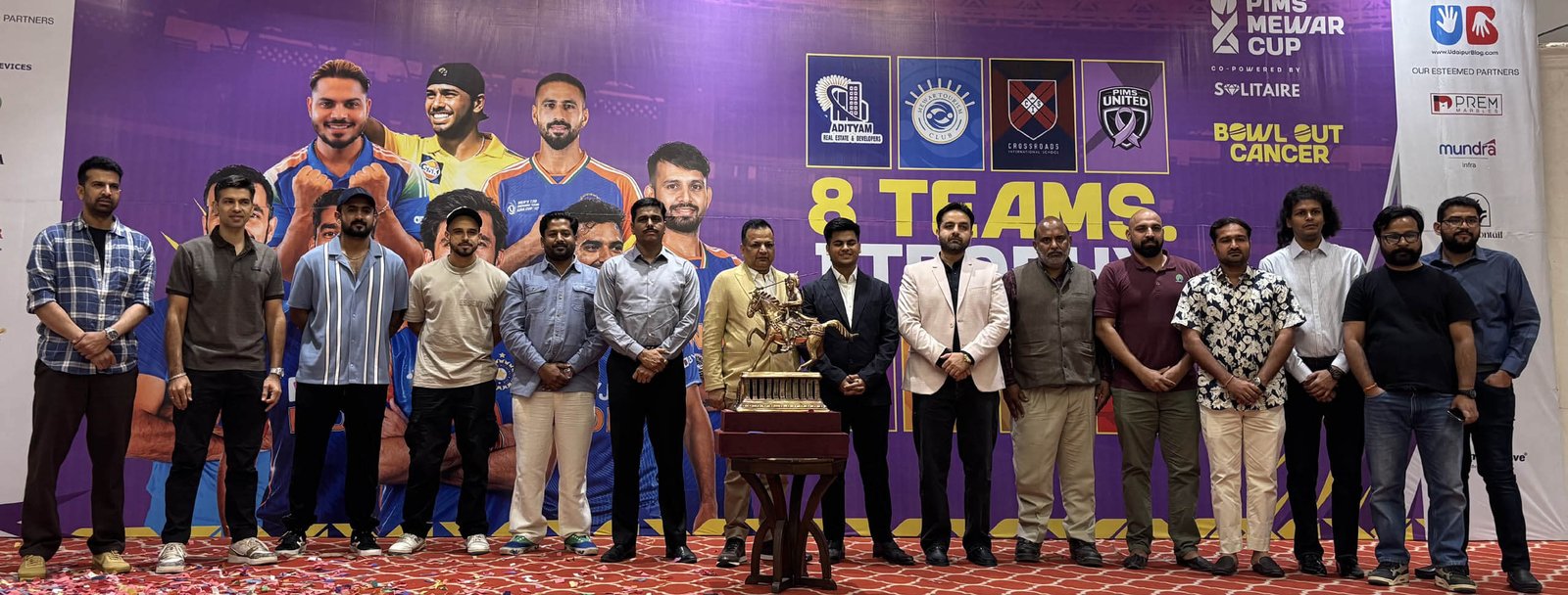 प्रतियोगिता में कुल 8 टीमें पिम्स यूनाइटेड, क्रॉस रोड्स, मेवाड़ टूरिज्म क्लब, जीसीए कोल्ट्स, आदित्यम रियल स्टेट, दिल्ली चैलेंजर्स, उदयपुर लेकसिटी वॉरियर्स एवं बालाजी कंस्ट्रक्शन्स टीमें ग्रुप ‘ए’ एवं ग्रुप ‘बी’ प्रारूप में भाग लेंगी।  इस टूर्नामेंट में 40 से अधिक आईपीएल खिलाड़ी अपनी खेल प्रतिभा का प्रदर्शन करेंगे। आयोजन का उद्देश्य केवल खेल प्रतिस्पर्धा तक सीमित न होकर एक महत्वपूर्ण सामाजिक संदेश से भी जुड़ा है। इस वर्ष टूर्नामेंट की थीम “Bowl Out Cancer” (कैंसर उन्मूलन का संकल्प) रखी गई है। विश्व स्तर पर प्रतिवर्ष लगभग 2 करोड़ लोग कैंसर से प्रभावित होते हैं। चिकित्सकीय विशेषज्ञों के अनुसार समय पर जांच एवं उचित निदान से इस रोग पर प्रभावी नियंत्रण संभव है।