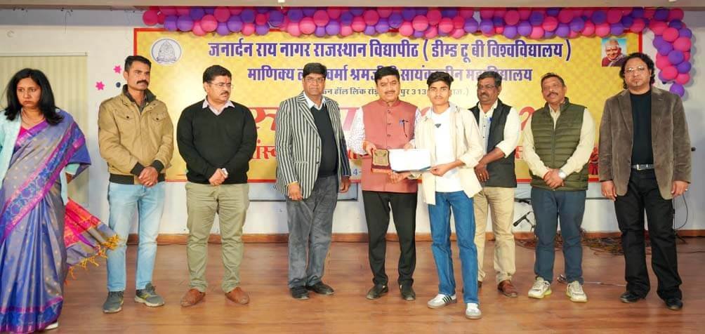 उदयपुर : राजस्थान विद्यापीठ विश्वविद्यालय के संघटक माणिक्यलाल वर्मा श्रमजीवी महाविद्यालय सायंकालीन विद्यार्थियों के लिए आयोजित तीन दिवसीय खेल प्रतियोगिता रस रंग 2025-26 का समापन संस्थान के सभागार में हुआ। प्रारंभ में अधिष्ठाता डाॅ. एसबी नागर ने अतिथियों का स्वागत करते हुए प्रतिवेदन प्रस्तुत किया। उत्कृष्ट खिलाड़ियों को पुरस्कृत करते हुए कुलपति प्रो. शिवसिंह सारंगदेवोत ने विद्यार्थियों का आव्हान किया कि समग्र विकास के लिए शैक्षणिक गतिविधियों के साथ साथ महाविद्यालय द्वारा आयोजित सह-शैक्षणिक गतिविधियों में भी भाग लेना जरूरी है जिससे शरीर, स्वस्थ एवं तंदुरस्त रहेगा। खेल से टीम भावना से काम करने, नेतृत्व क्षमता व धैर्यता के साथ आगे बढ़ने की क्षमता विकसित होती है।
